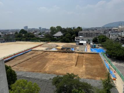 調査地:今里四丁目地内(長三小グラウンド内) 今回の調査は、長岡第三小学校の再整備工事に伴うものです。乙訓寺は、寺伝によれば推古天皇の勅願によって聖徳太子が開基したと伝えられています。文献では、造長岡宮使藤原種継の暗殺に関わったとされた早良親王が幽閉された場所として登場します。空海が一時別当を務めたことでも知られ、江戸時代には五代将軍綱吉の母桂昌院によって再興されました。