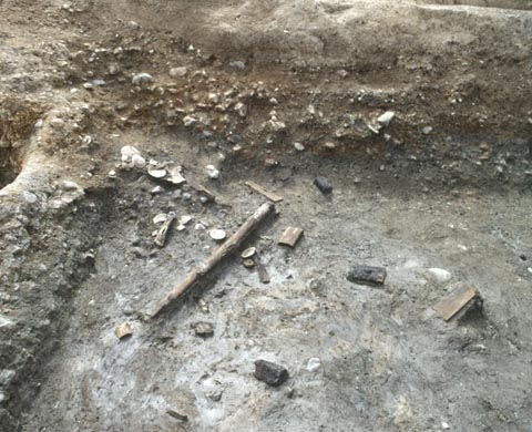 | 城跡の概要 | 今里城跡は、能勢氏(西岡地方の国人)の城館と考えられている。平成2年の発掘調査によって堀、木橋、井戸など城館の一部が明らかになった。発掘調査地点の周辺には「城山」という小字が残り、小字の近辺が城館の中心とも推定される。 |